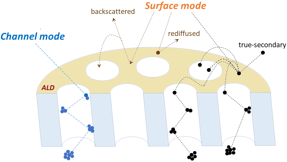 MCP-PMT (microchannel plate PMT) 以微通道板作为倍增结构, 由大量毛细玻璃管构成二维阵列, 每个通道内壁覆有次级电子发射材料, 可视为许多并行的独立电子倍增通道. 在通道两端施加电位差后, 入射电子进入通道并在斜入射几何下多次碰撞管壁, 每次碰撞产生次级电子并继续被加速, 最终在通道末端形成电子云并被阳极收集. MCP 的并行通道结构带来更高的电子收集效率与更大的有效探测面积, 但由于通道内漂移路径分布更宽, 以及工艺与读出结构差异, 其 Transit Time Spread (TTS) 往往显著大于典型 dynode-PMT. JUNO 采用 MCP-PMT 与 dynode-PMT 并行部署, 在覆盖率, 效率, 寿命与成本等工程约束之间取得平衡.
