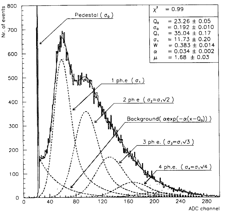 图 3 典型电荷积分直方图[4]图 3 展示了一个典型的电荷谱拟合例子: 数据直方图由 pedestal, 1 PE 以及 2–4 PE 等分量叠加构成, 并通过拟合得到 (SPE 标尺), (分辨率) 与 (占空比) 等参数.