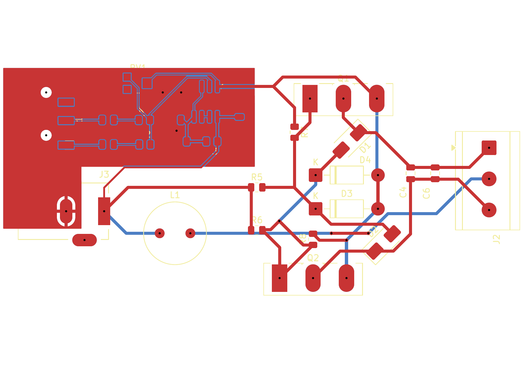 我参考了 How to Build a Simple But Powerful Flyback Driver 所示的 Mazzilli ZVS 思路, 由两只 IRFP4668PbF MOSFET 组成对称自激结构. 输入电感 L1 向高压包一次侧中心抽头供能, 两个功率管交替导通, 在一次侧和谐振电容 C4 之间形成高频谐振回路. C4 与 C6 取值为 , 用于维持 ZVS 所需的谐振条件.